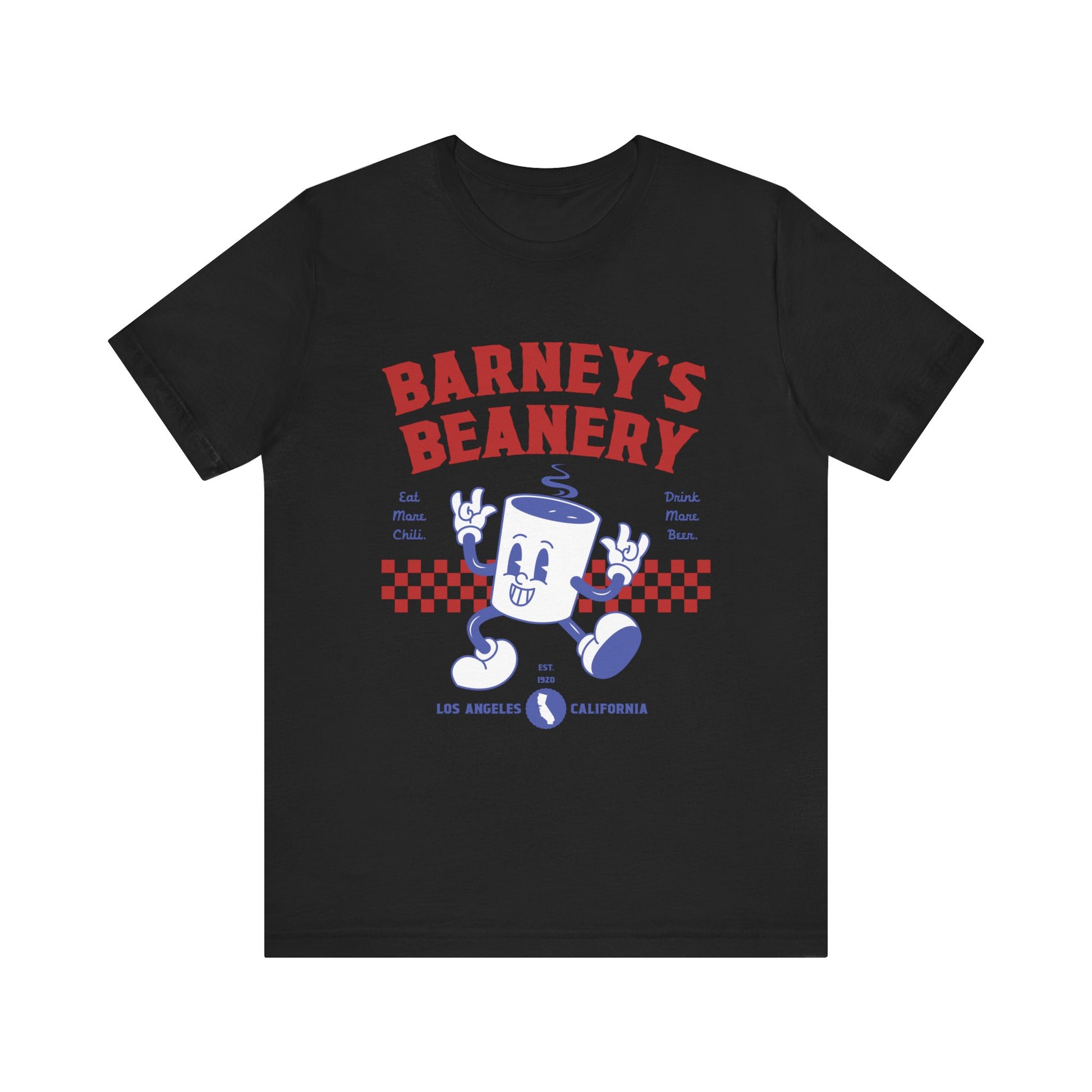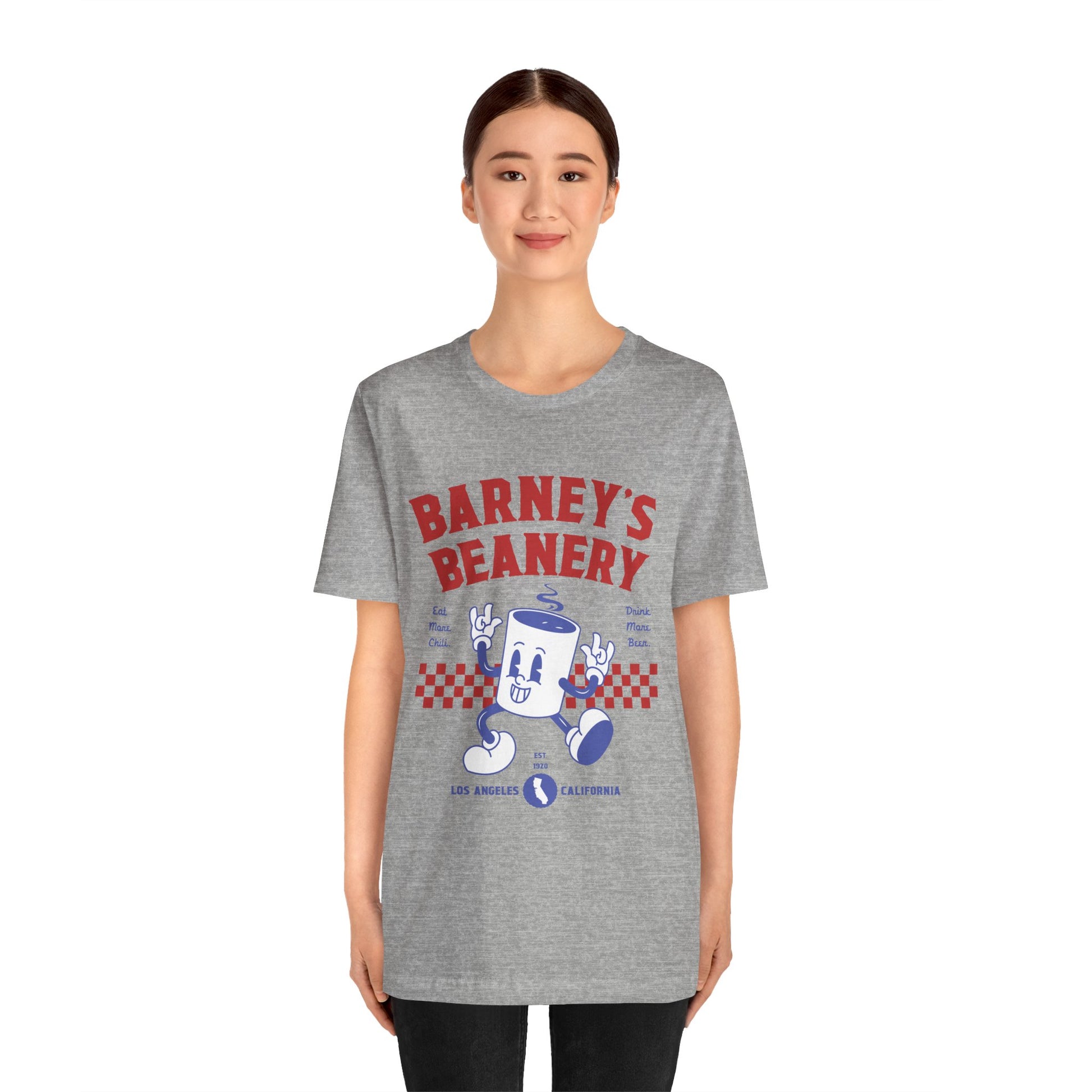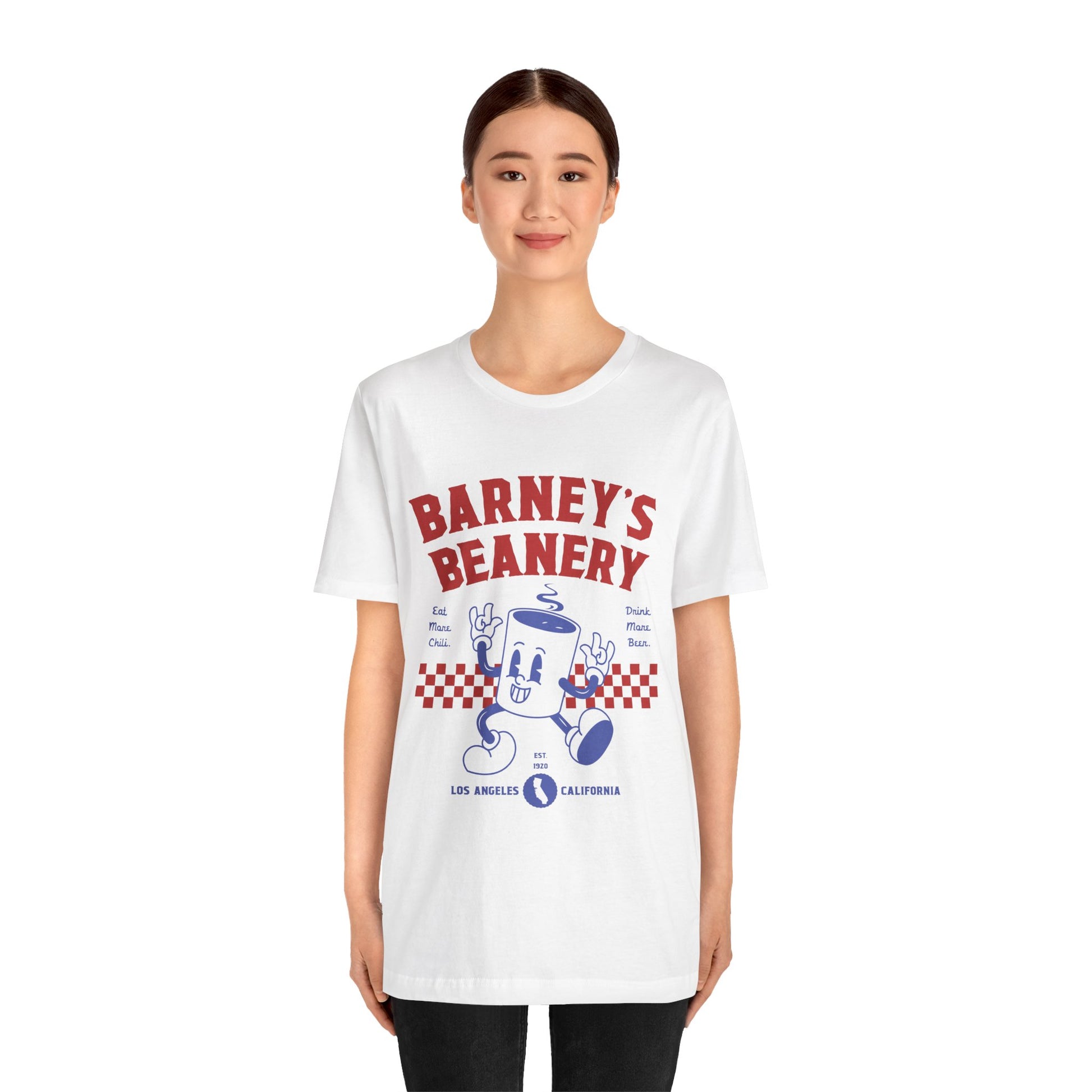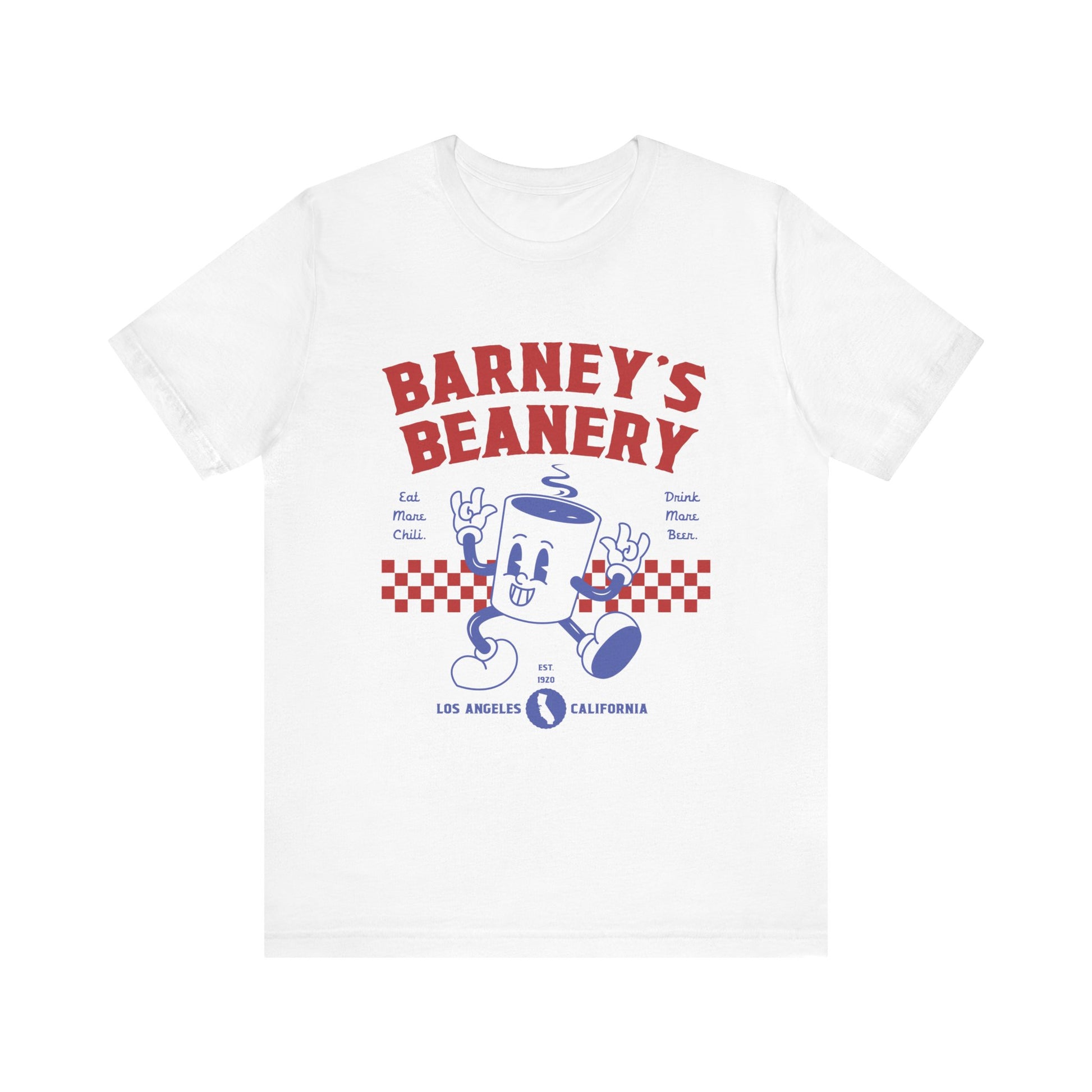 Eat More Chili. Drink More Beer. BARNEY'S BEANERY Red & Blue - Womens Retro Graphic Tee | Bella + Canvas 3001 - Retro Character On FRONT