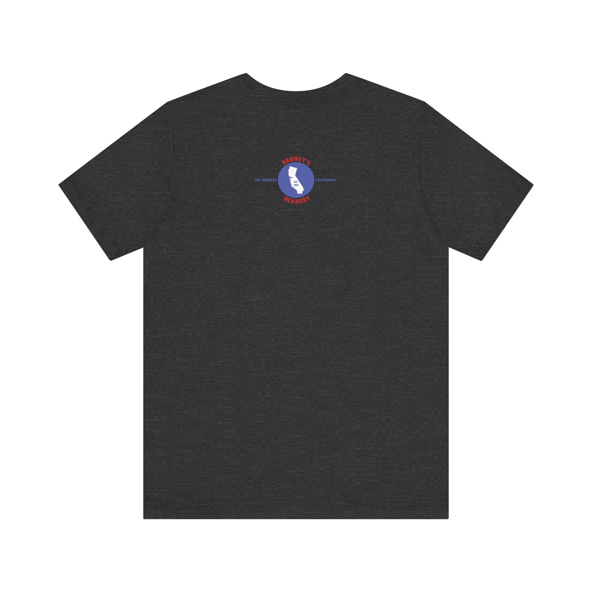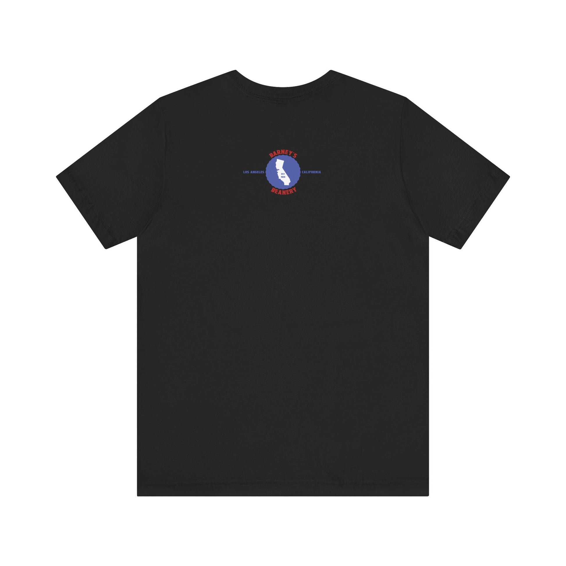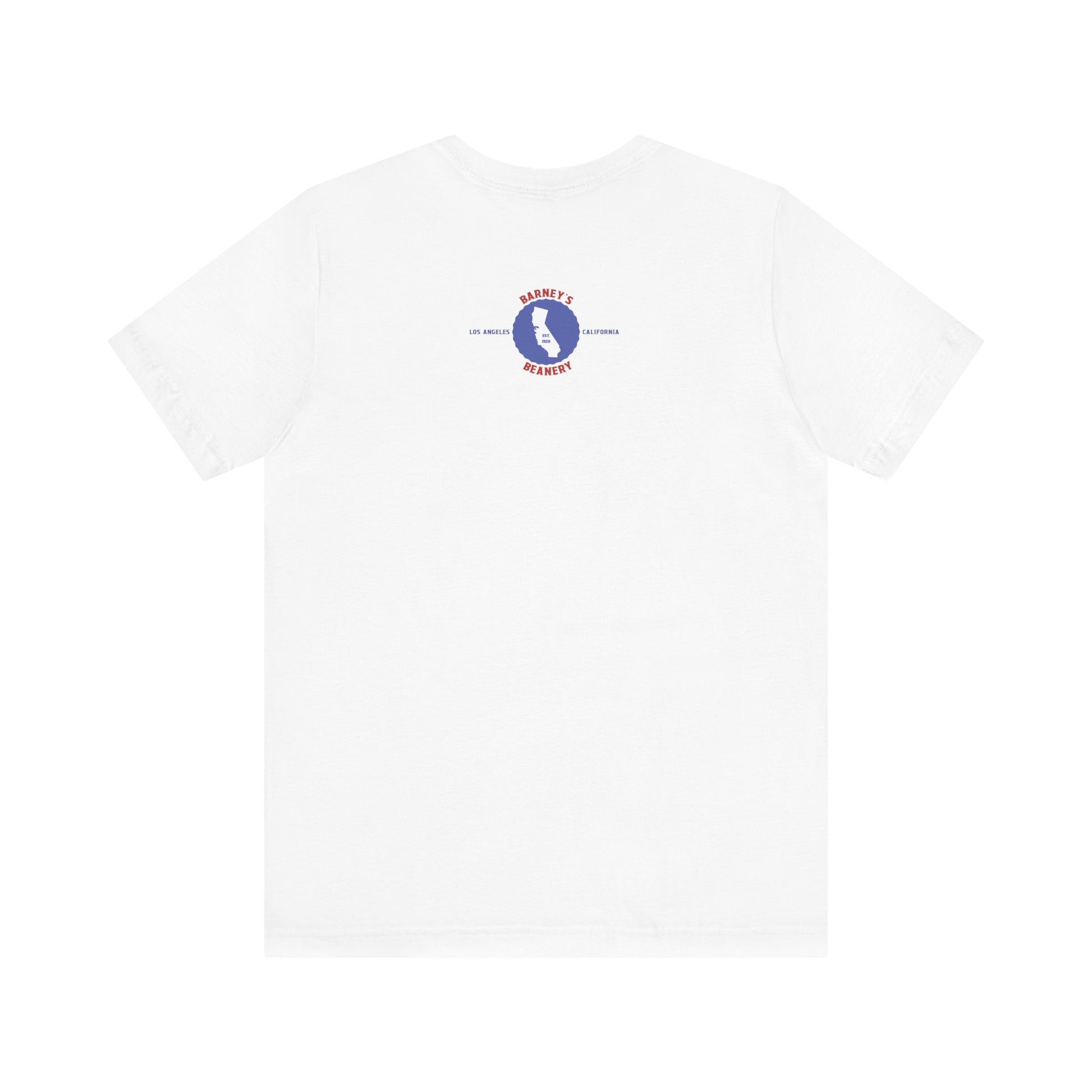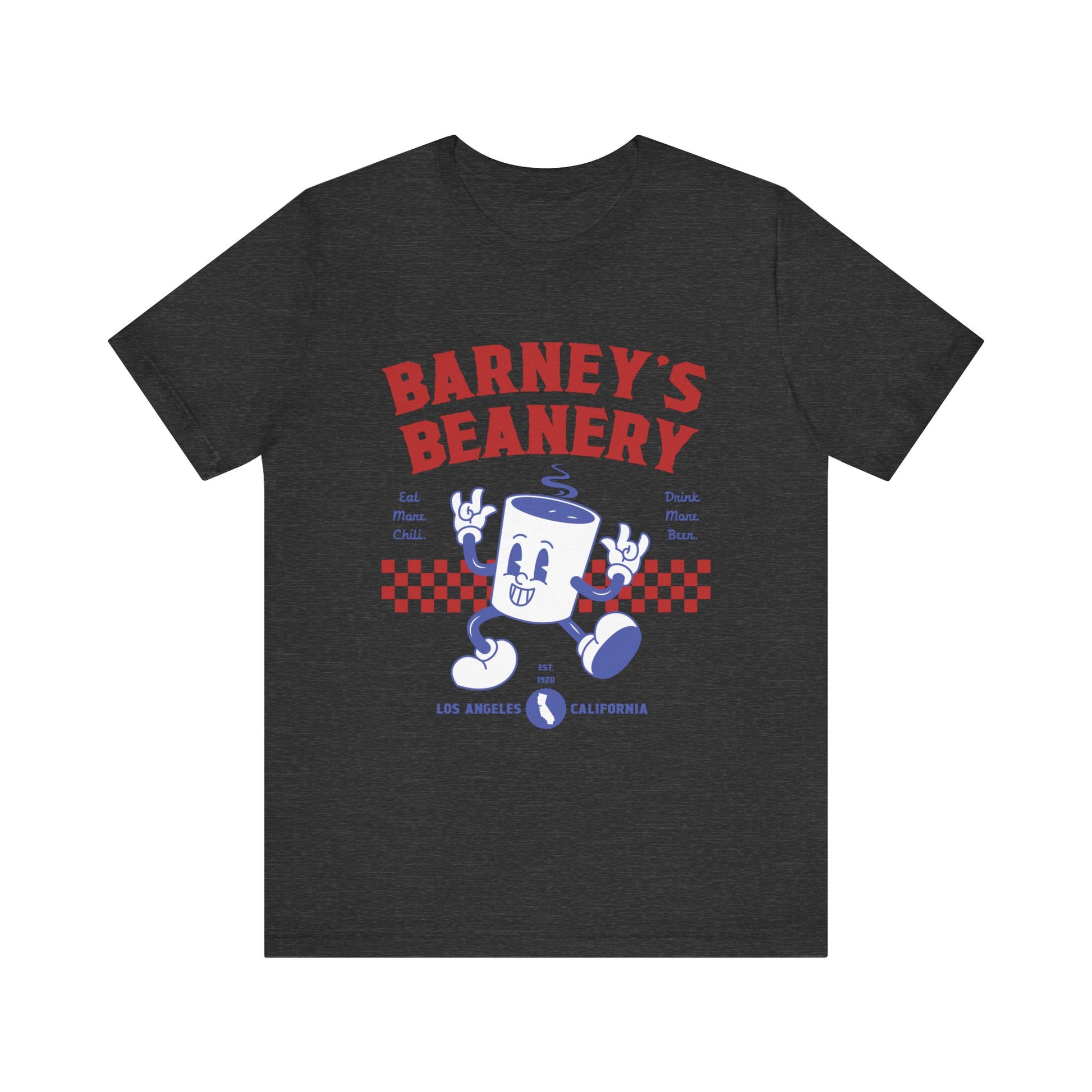Eat More Chili. Drink More Beer. BARNEY'S BEANERY Red & Blue - Womens Retro Graphic Tee | Bella + Canvas 3001 - Retro Character On FRONT